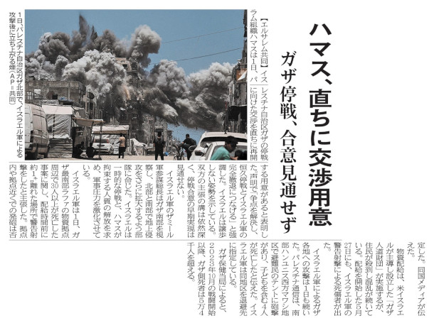 「えっほんと!?」私は記事を見た時かすかな希望と激しい驚きを感じた。私はガザにハマスが恒久停戦を提案していることを知った。「戦争が止まることはないだろう」と思っていたため、恒久停戦を提案していることを知り、驚きとともにかすかな希望を抱いた。「争点を解決し、恒久停戦とイスラエル軍の完全撤退につなげる」とハマスは強調したそうだ。争点を解決すれば根本から解決され、もう起きなくなるだろうから素晴らしいことだと思った。