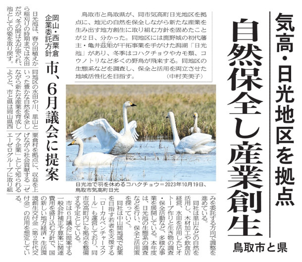 記事を読むと、鳥取県や鳥取市などが同市気高町の生態系などを調査し自然保全と産業創生を両立させた地域活性化を目指していることが分かりました。「産業創生」とは地域の活性化や持続的な発展を目指し、新たな産業を創出したり、既存の産業を活性化したりする取り組みのことだそうです。気高町の「日光池」は春の田植えから稲刈りの時期までは水田で冬の間は水が張られ、コハクチョウやカモ類、コウノトリなど多くの野鳥が発生するそうです。