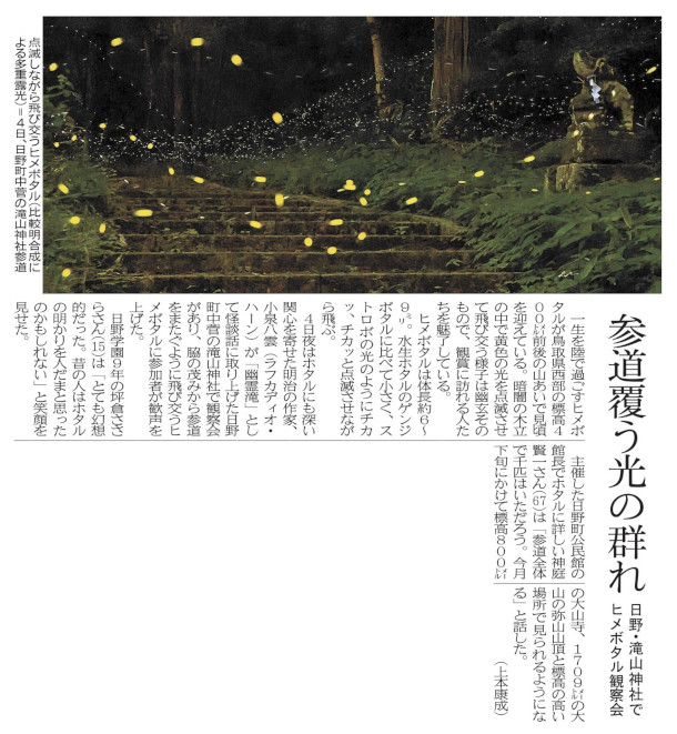 記事を読んで感じたことは、大山でもヒメボタルが見られることに、おどろきました。標高800メートルの大山寺、1709メートルの大山の弥山山頂と標高の高い場所でもヒメボタルが舞っていました。登山者は、ホタルを見て、とても喜んだだろうなと思いました。そんな高いところでもホタルはとぶことができることにびっくりしました。すごくきれいに光り、約千〜2千びきはいるであろうとすい定されています。
