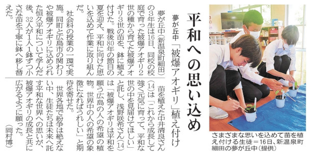 そんなときにこの記事を読んで、被爆地ではない兵庫県で、アオギリの植え付けが行われたことはとても素晴らしいことだと思いました。私が通っていた小学校でもアオギリが植えられていて、そのアオギリやアオギリの歌を通して楽しく前向きな気持ちで平和学習に臨むことができました。今回アオギリの植え付けが行われたことにより、夢が丘中学校でも平和学習の機会が増えるのではないかと考えました。全国に平和学習が普及することは、日本全体にとってとても良いことだと思います。これをきっかけに少しずつでも平和学習が普及していけば、日本全体でもっと恒久平和への意識が高まっていくと思いました。