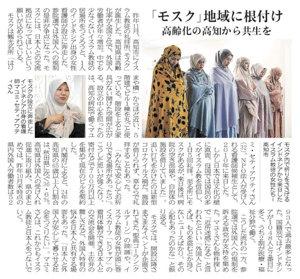 昨年11月、高知市に寄付などによってイスラム教徒の礼拝所「モスク」が誕生した。記事には、外国人労働者の孤立、日本で直面した文化の壁が紹介されており、今回建てられたモスクは、それらの問題を解決するための2つの役割を担っている。まず1つ目の役割はイスラム教徒が安心して過ごせる居場所であるということだ。外国人労働者の多くは地域とのつながりが薄く、休日を家にこもって過ごしたり、言語の壁によって日常生活に不安を抱えている。モスクで同じイスラム教徒の人と礼拝を行ったり、コミュニケーションをとる事で、そうした不安・孤独を解決できる。そして2つ目の役割は日本人と外国人の交流の拠点である。先述の通り、外国人の多くは言語の壁や文化の壁によって日本人や地域とのつながりが薄い。このモスクは、コーランの読誦やヒジャブの着用体験などのイベントを実施し、外国人と日本人をつなげる場、互いの文化を理解して偏見や先入観を無くしていく場として順調に機能している。