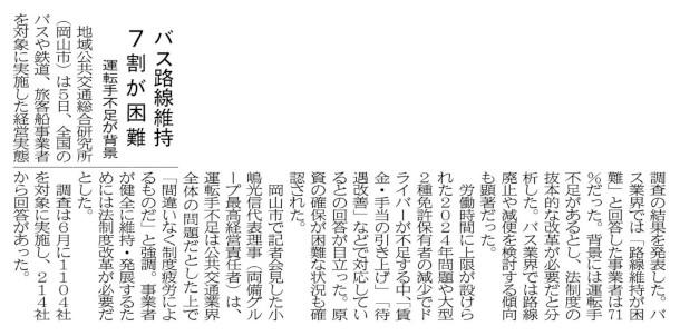 僕は修学旅行や宿泊研修の時にバスに乗ったが、バスの中で友達との会話や遊びがとても楽しく、窓からの景色がきれいだったことを覚えている。また、小学校低学年の時には、バスに乗りたいと両親にお願いして、くる梨という鳥取市内を循環するバスで1周回って元の場所に戻ってきたという出来事もあった。僕にとってバスにはとても良いイメージがあった。バス路線維持を困難だと71%の事業者が回答したことに僕は正直おどろいた。